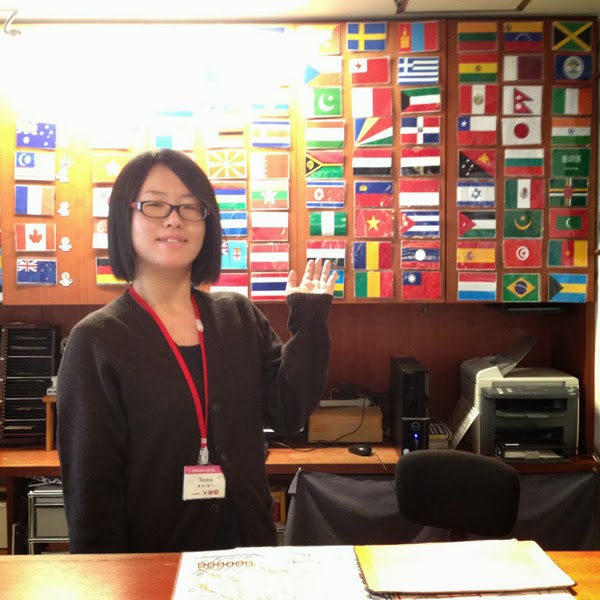フロントでは、沢山の国旗をバッグに店長のTomoさんが迎えてくれました。「展示は階段になります。まずエレベーターで六階にお上がりになり、そこから階段をずっと降りてきて下さい」との説明を頂きました。
