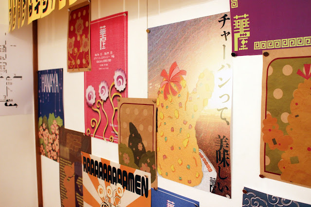 部屋の中に満遍なく張られた「華屋」のロゴデザインと中華メニューのポスター、そして真ん中に陳列された食べ物をモチーフにした立体作品、その熱量に圧倒されます。