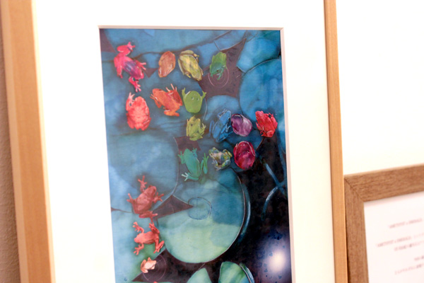 | 鈴木瑞 「カエルのうた」 続いてこちらも豊かなカエル達が登場する。 上から俯瞰するこの光景からは、 碁盤とか升目が見え隠れする。 カエルのもっと前、おたまじゃくしの頃。 五線譜に身を寄せて、楽譜を構成するかのような。 彼の歌声と、その奏で。 視覚を通じて、聴こえますように。 |