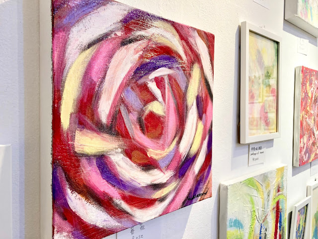 こちらの作品は「薔薇」。赤い薔薇を赤一色ではなく、複数の色使いと中心から広がっていくような流れで描かれています。紫や黄色がかった色味が光の反射に見え、美しく輝く生き生きとした薔薇に感じられます。