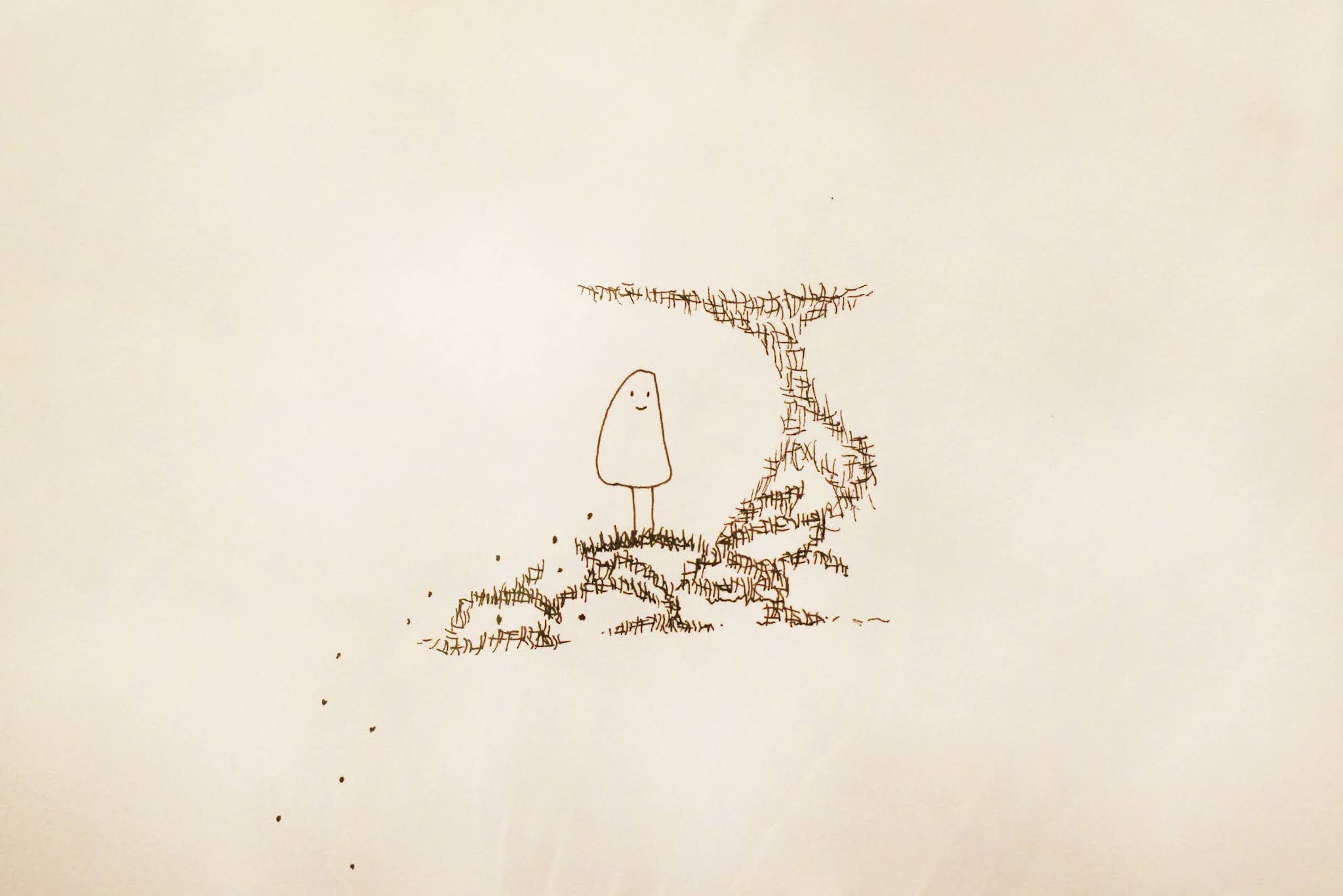 貼られた紙に描かれているのは、動物や植物、架空の生き物。自分しかいない空間になった時、肩の力が抜けると同時にそっと癒してくれるような、カラフルな色紙に描かれた可愛らしいイラストにほっこりします。
